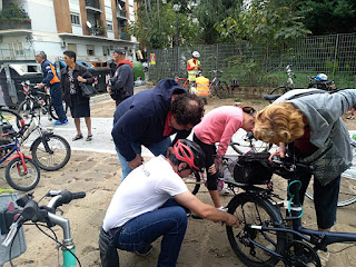 Con noi era presente anche Valerio, dell’associazione Ciclonauti https://www.ciclonauti.it/ che ha aiutato inizialmente molte persone nel sistemare la propria bicicletta, chi per una vite, chi per le ruote sgonfie, chi problemi con i freni, ed altri problemi che solo un esperto della bicicletta come lui può fare ma soprattutto rendendo felici i bambini presenti.